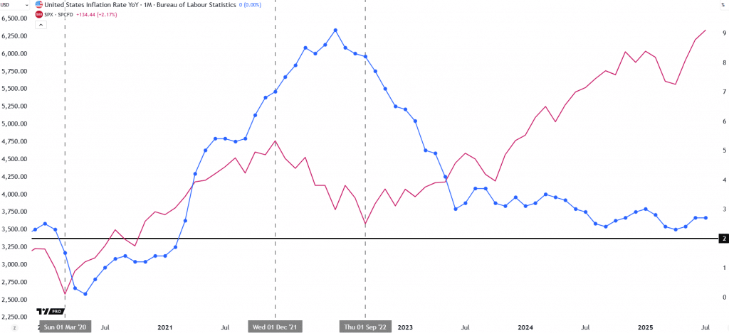 通膨與金融市場的漲跌並非簡單對立,即使在高通膨環境下,市場也可能上漲,關鍵在於通膨是否可控、符合預期。以全球最重要的金融市場 – 標普500指數與美國通膨的關係為例,下圖展示了2020至2025年兩者的對比走勢。