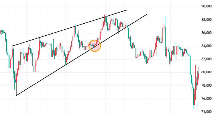 下方的圖表展示了比特幣在2025年3月四小時週期中形成的一個典型上升楔形。當價格走到黃色圓圈標記的位置反彈時,這一段上漲走勢便顯現出明顯的上升楔形特徵 – 上下兩條趨勢線同步向上收斂。