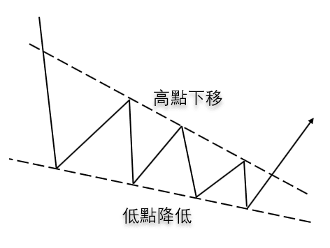 下降楔形的價格在震盪中,高點與低點都不斷降低,整體走勢逐漸收窄。連接高點時常可畫出一條下降趨勢線,連接低點則能得到一條支撐線。