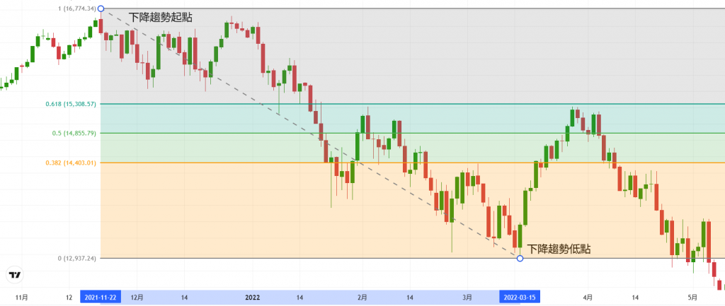 上圖展示的是那斯達克100指數在2021年底至2022年初的下跌走勢,在2022年3月15日創出階段低點後的反彈,在61.8%的斐波那契回撤位結束。