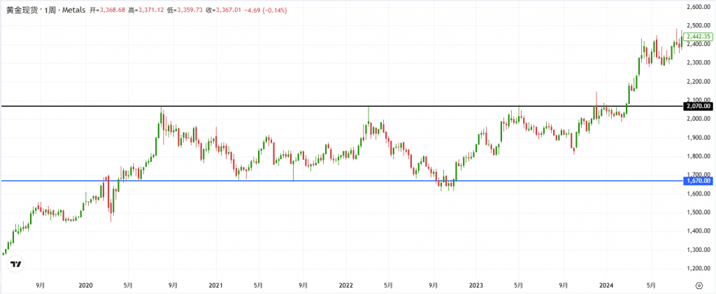 上方黃金現貨週線圖的示例中,藍線為明顯的前低支撐線,黑線則為明顯的前高阻力。