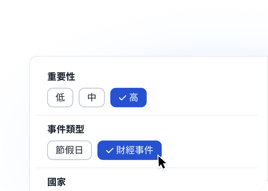 您可以按影響力等級、事件類型或國家/地區篩選事件,輕鬆根據您的需求自訂日曆。