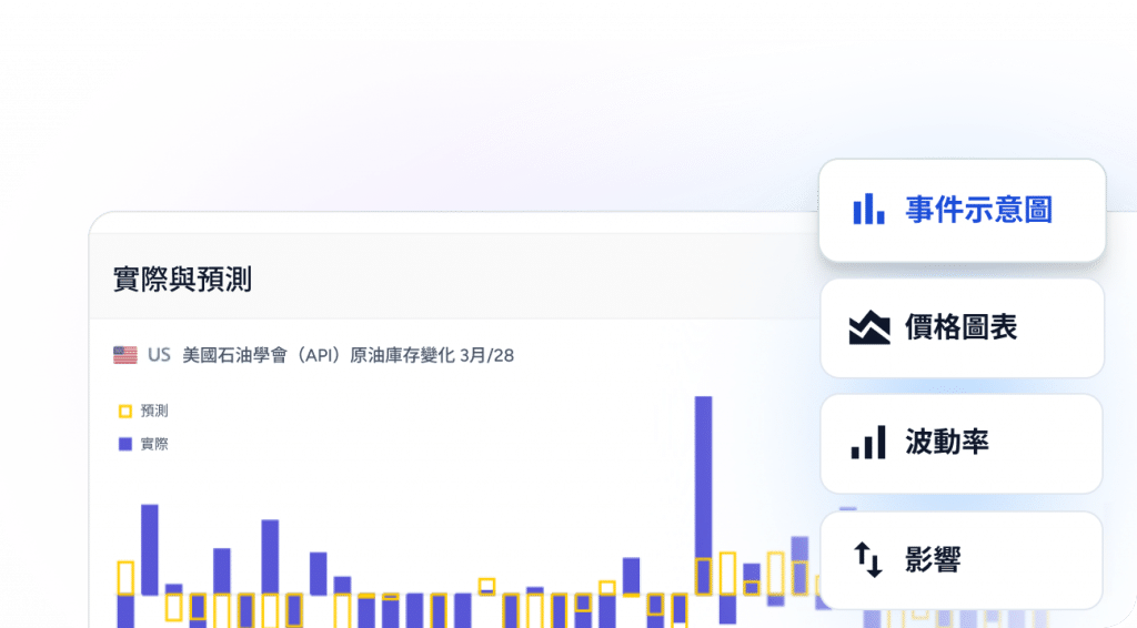 查看歷史波動率、價格走勢、市場影響以及比較過去財經事件實際數據與預測數據的圖表。