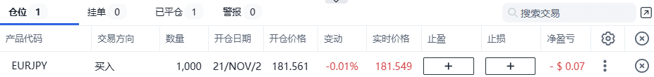 完成设置并点击确认下单后,建立的EURJPY市价单会显示在图表下方的「仓位」窗口,在这里您可以查看实时盈亏、修改止损和止盈、以及操作平仓。
