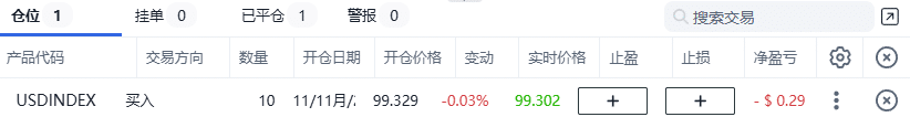 确认下单USDINDEX后,市价单会显示于图表下方的「仓位」窗口中。在这个窗口我们可以查看实时盈亏、修改止盈止损,或随时手动平仓。