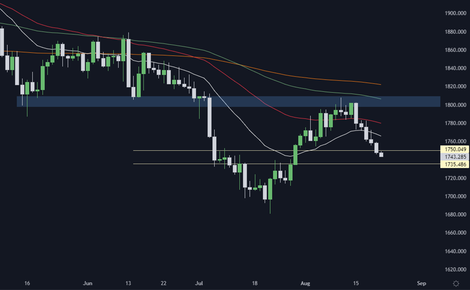 黄金价格在上周一开市后从 1800.00美元 一直下跌至 收市时的 1745.500,收低于主要支撑 1750.00 以下,目前黄金在 1750.00 - 1735.00美元一带的关键区域,总体上来说黄金依然有望持续下跌,但主要还是又美元驱动黄金价格的走势。