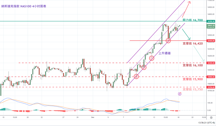 从中短线4小时图表看,纳斯达克指数11月在15,750与16,100区间横摆了整个月后,于12月11号往上突破了16,100,并形成了一个较强的上升通道。