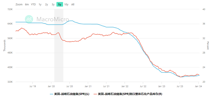 美国战略原油储备量自2022年中旬一直减少,从2022年的584k减少至354k。这使得即便原油产量减少,但价格还是下跌。