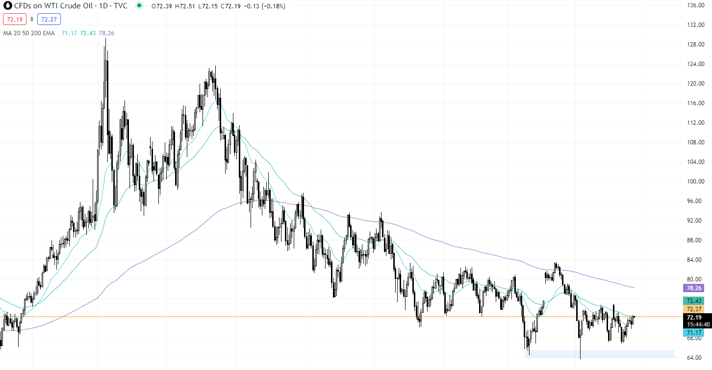 WTI原油目前处于中长期的关键阻力位72.4美元下方,短期内是否能突破该阻力位将成为其走势关键。突破该阻力位将上试200EMA的阻力位,反之将下试65美元左右的支撑。交易员可以等待其确认方向后再入场。
